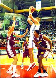 Rubén Wolkowyski se eleva ante los jugadores venezolanos... Argentina fue superior y venció otro partido en el Premundial