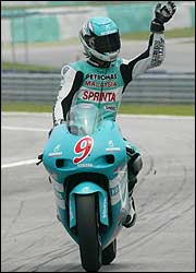 En la vuelta 15, donde logré mi mejor velocidad final, antes de la entrada a la recta, en la frenada, hice un "ensayo de sobrepaso" y lo superé a Battaini. Sentí que en las tribunas el público malayo aplaudía mi acción. Pero, ¿creen que se puede correr y disfrutar lo que sucede al borde de la pista? Ni Battaini ni De Puniet me permitían pensar en otra cosa, ya que al final de esa recta ya estaba nuevamente en el 6to. lugar.