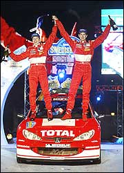 Marcus Gronholm celebra en su Peugeot después de ganar el Rally en Suecia