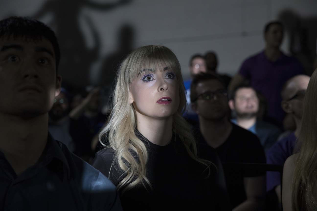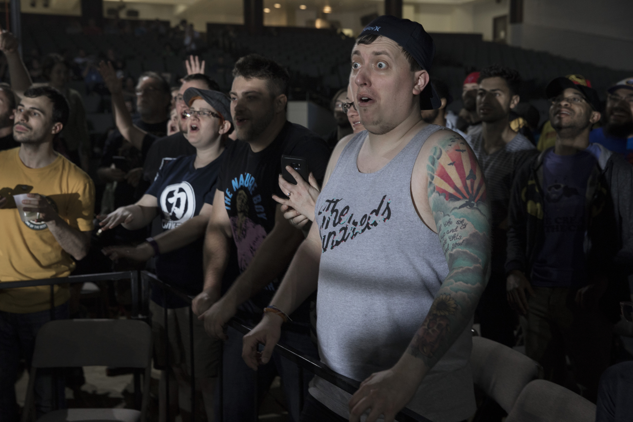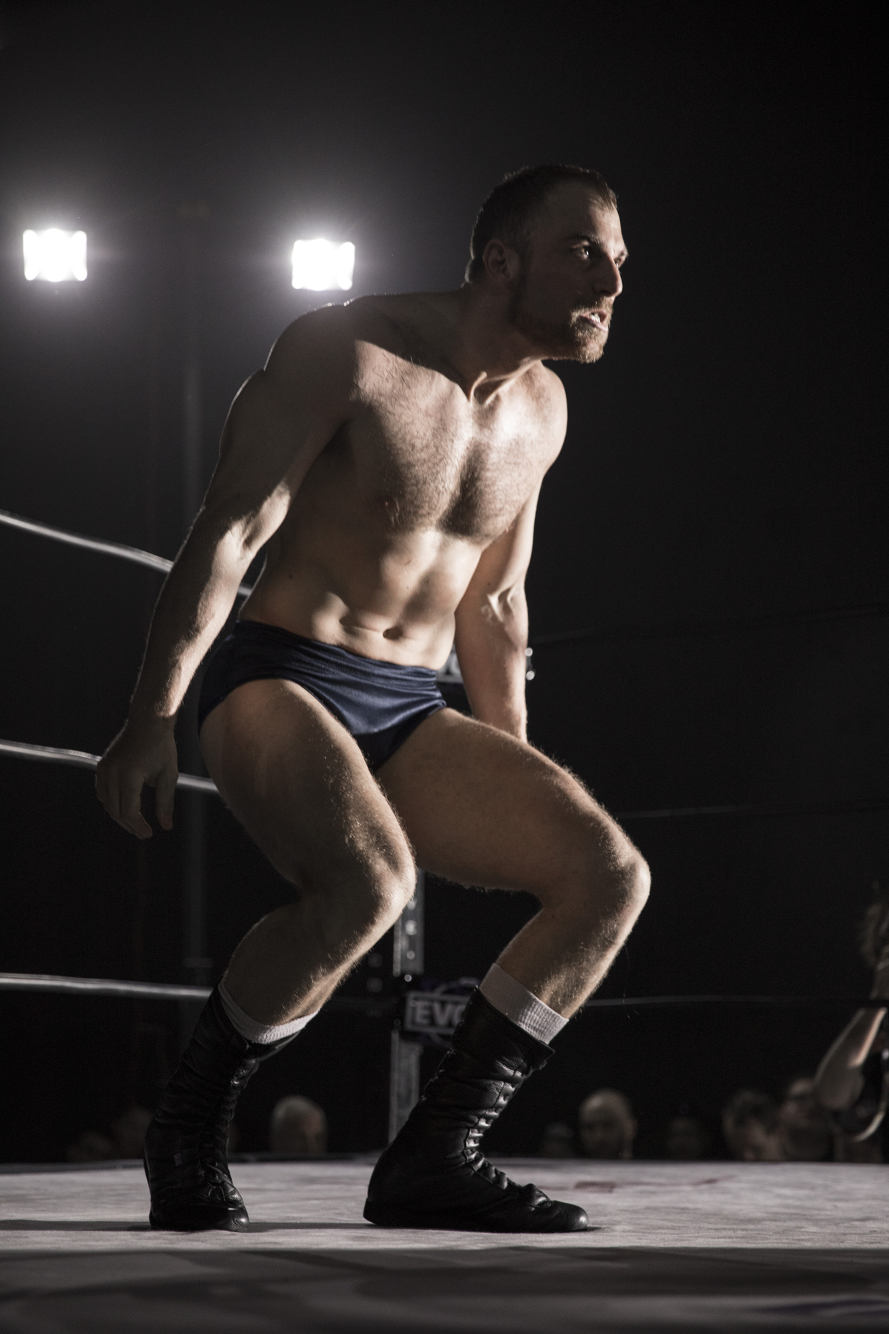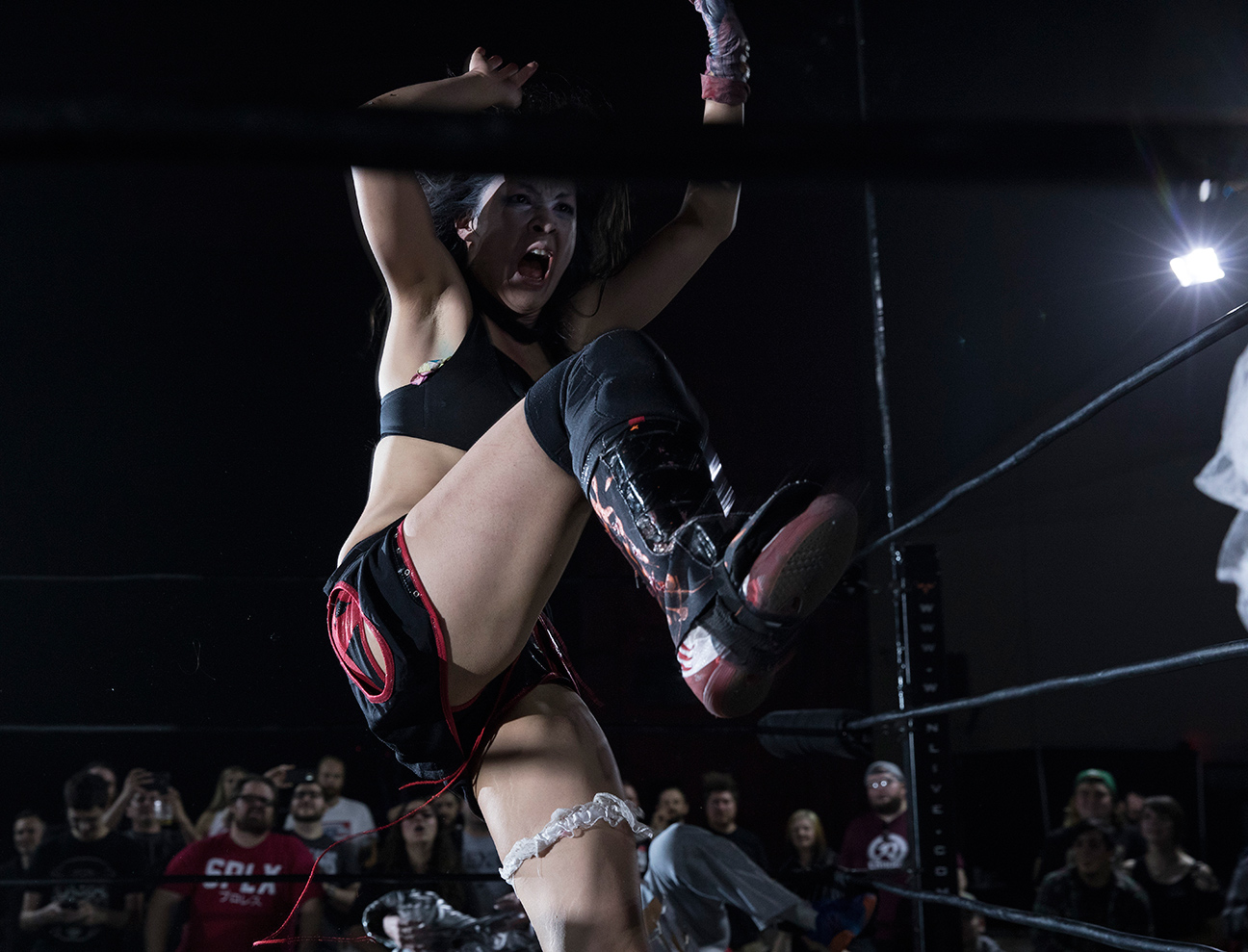 Joanna Rose, actriz británica, sirve como anunciadora en el ring para varias empresas de lucha libre, entre ellas EVOLVE. Ella luce enfocada en medio de la multitud mientras el campeón de EVOLVE Zac Sabre Jr. se mide al ex campeón de la empresa PROGRESS Mark Haskins como parte del súper show de WWN: Mercury Rising 2017: Evolve vs. Progress.