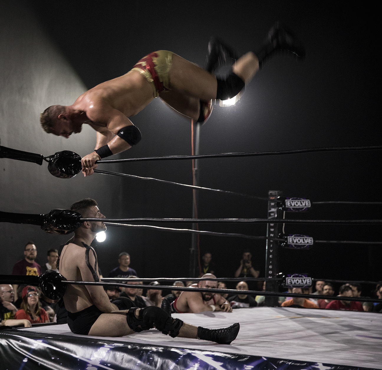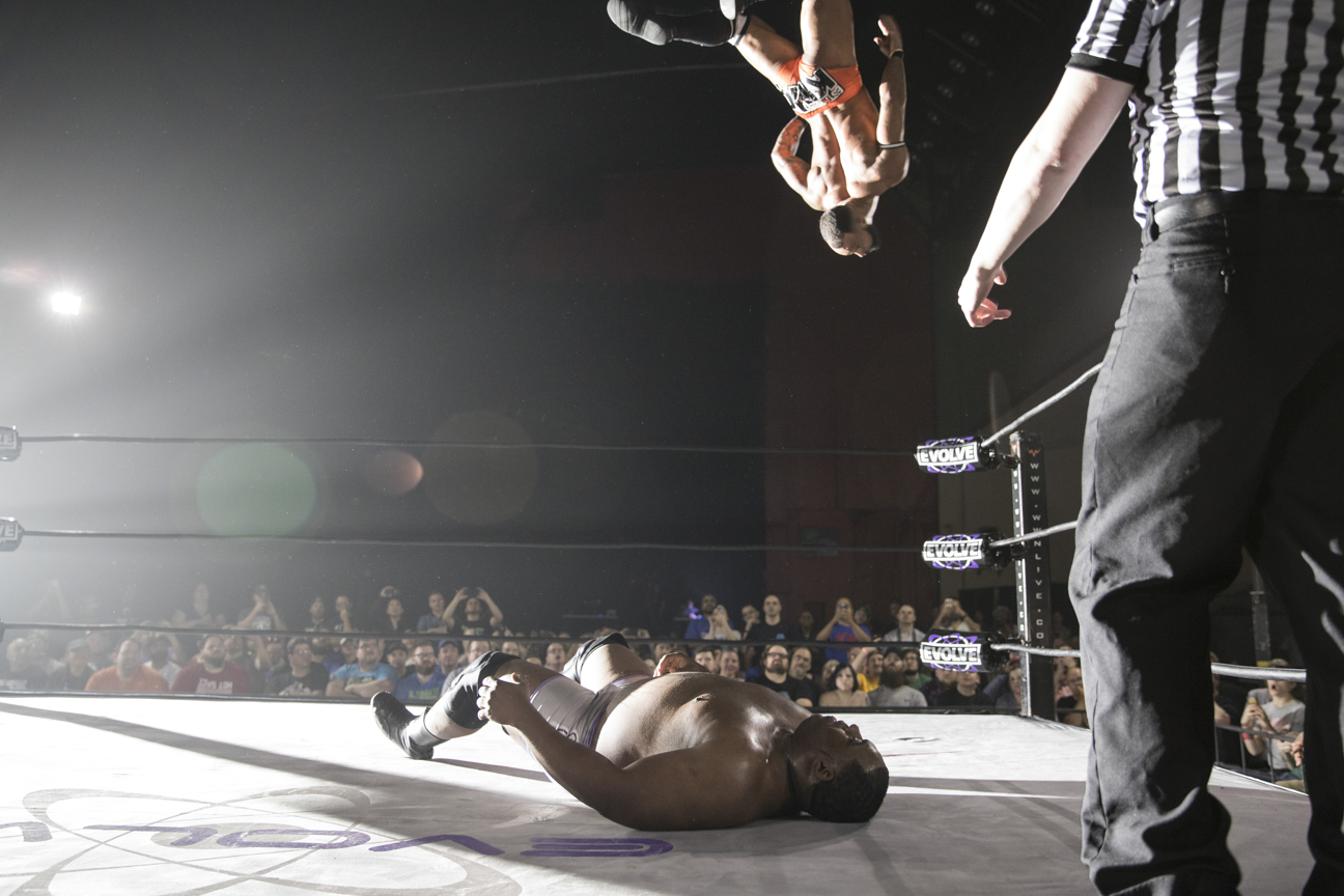 Donovan Dijak se levanta por los aires antes de caerle encima a Tracy Williams con una patada. Ellos están en lados opuestos del choque titular en parejas de EVOLVE que además involucra a Michael Elgin (socio de Dijak) y Fred Yehi (socio de Williams, y la otra mitad de los campeones mundiales en pareja de EVOLVE).