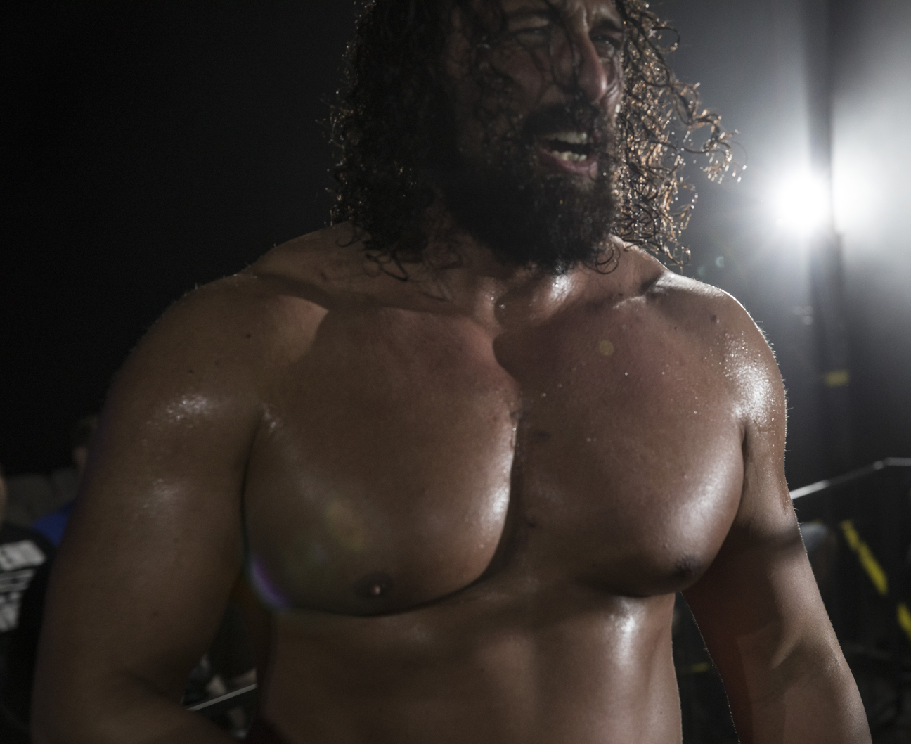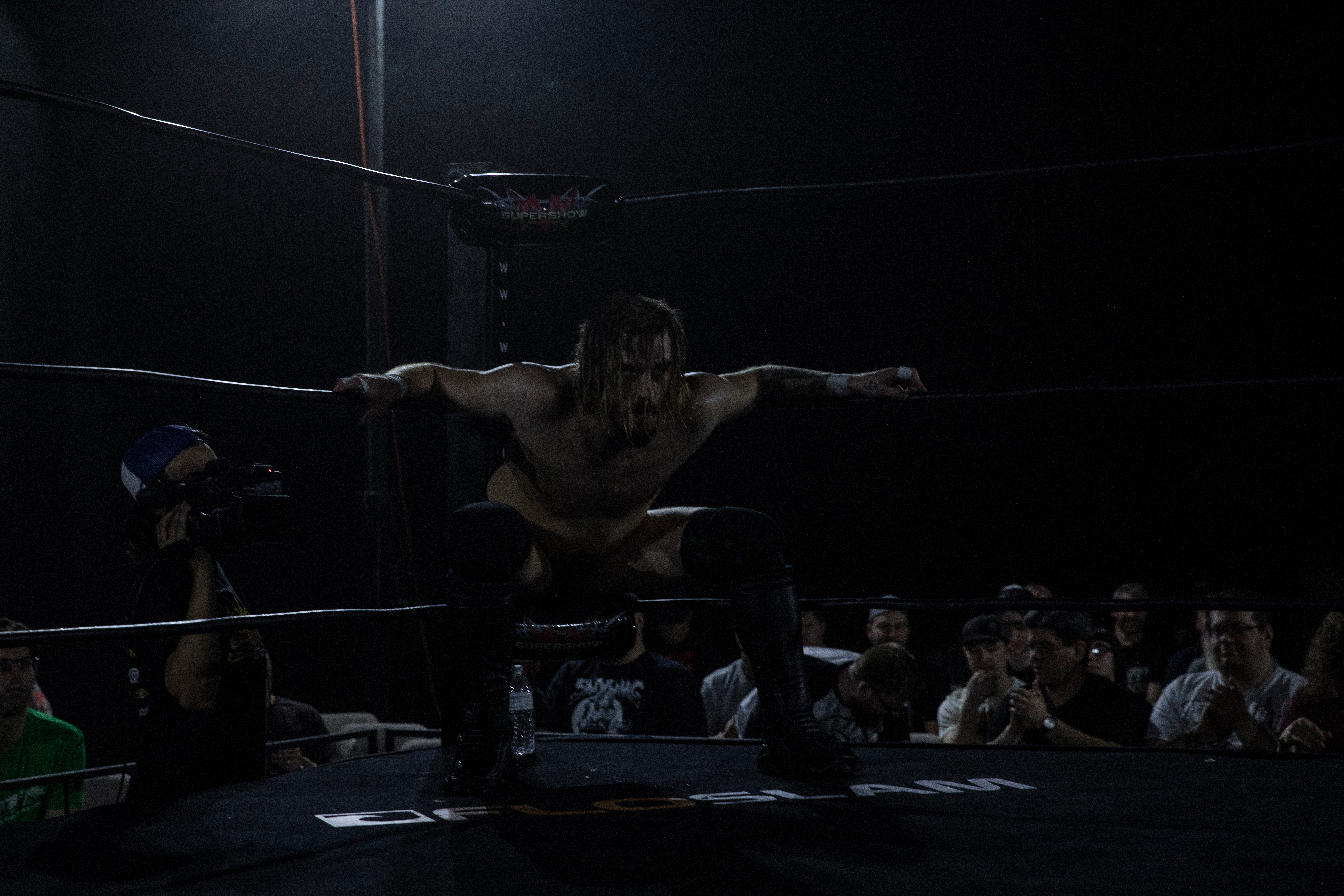 Mark Haskins se sienta en la esquina, esperando el inicio de su lucha por el campeonato de EVOLVE ante Zack Sabre Jr. como parte del super show de WWN: Mercury Rising 2017: Evolve vs. Progress.
