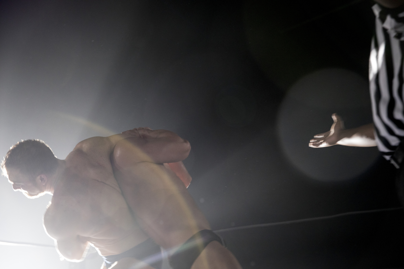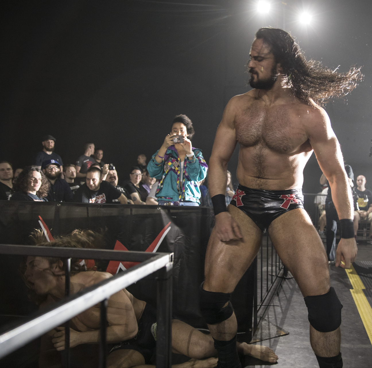 Drew Galloway, luchador profesional escocés y ex estrella de la WWE, en primer plano, y Matt Riddle, ex peleador de UFC fighter, yacen exhaustos en la lona durante su cruento combate como parte del evento EVOLVE 80 el jueves en la noche. Dos noches más tarde, Galloway, bajo el nombre de Drew McIntyre, anunció que había firmado de vuelta con la WWE como parte de su marca de desarrollo NXT.