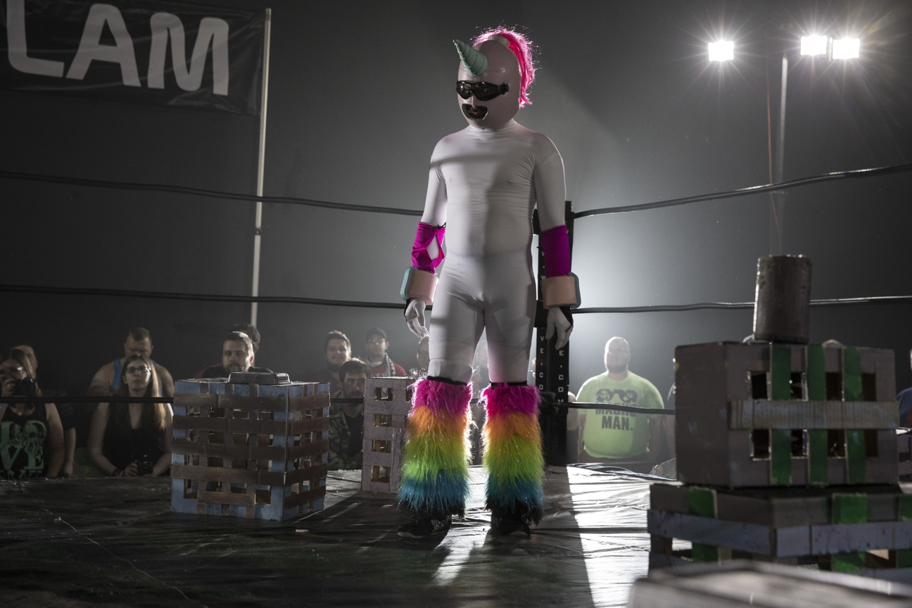 El Unicorn Party se prepara para el choque de apertura del Kaiju Big Battel en el Orlando Live Events. Contrario a otros eventos de lucha libre, todo desde la lona hasta el área de ringside son transformadas para crear la ilusión de una batalla monstruosa en medio de la ciudad.