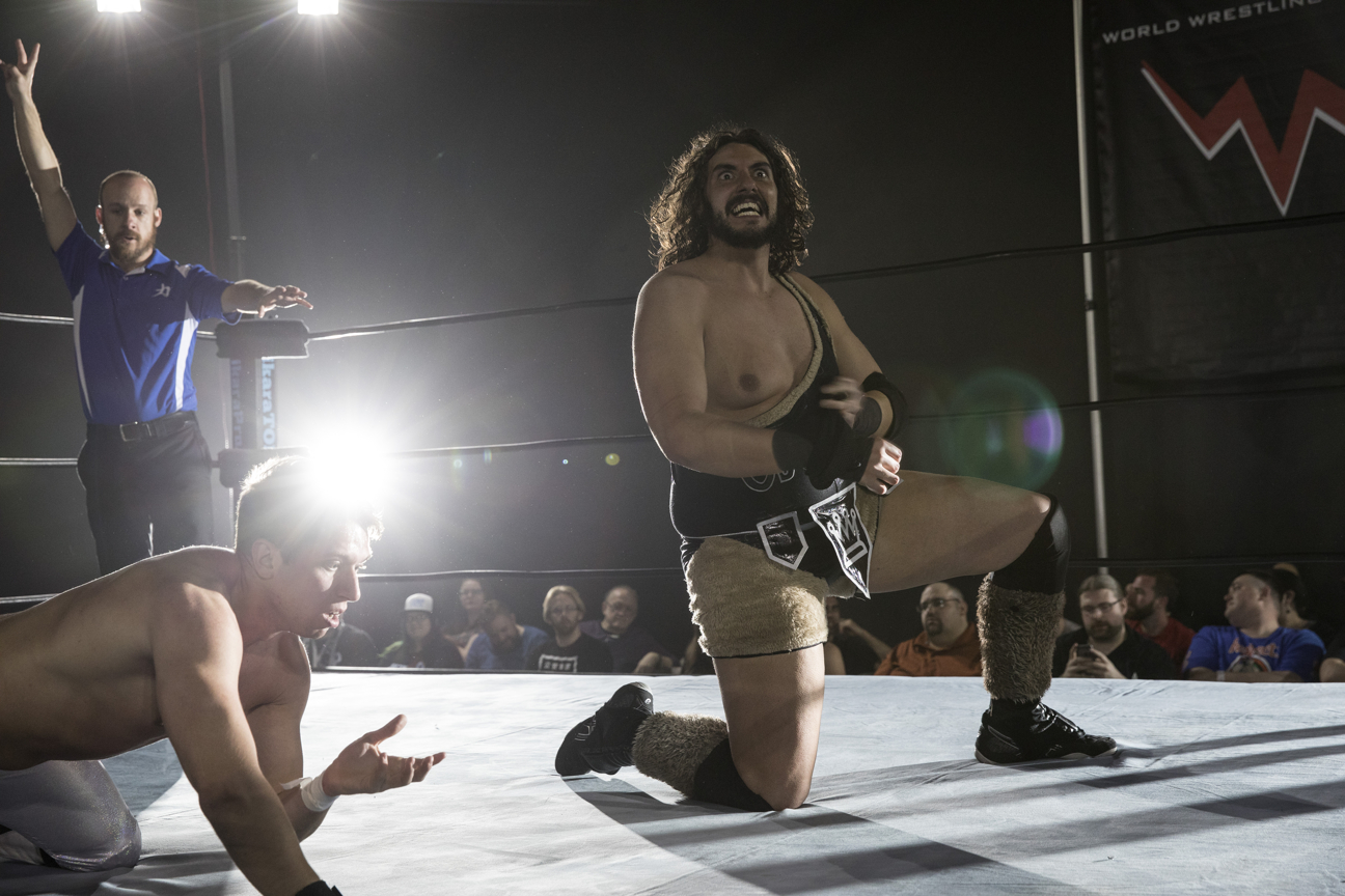 Oleg the Usurper se coloca sobre una rodilla de forma triunfal durante su choque con Race Jaxon como parte del evento de Chikara Pro Wrestling "Turn Left" en el Orlando Live Events Center el viernes.