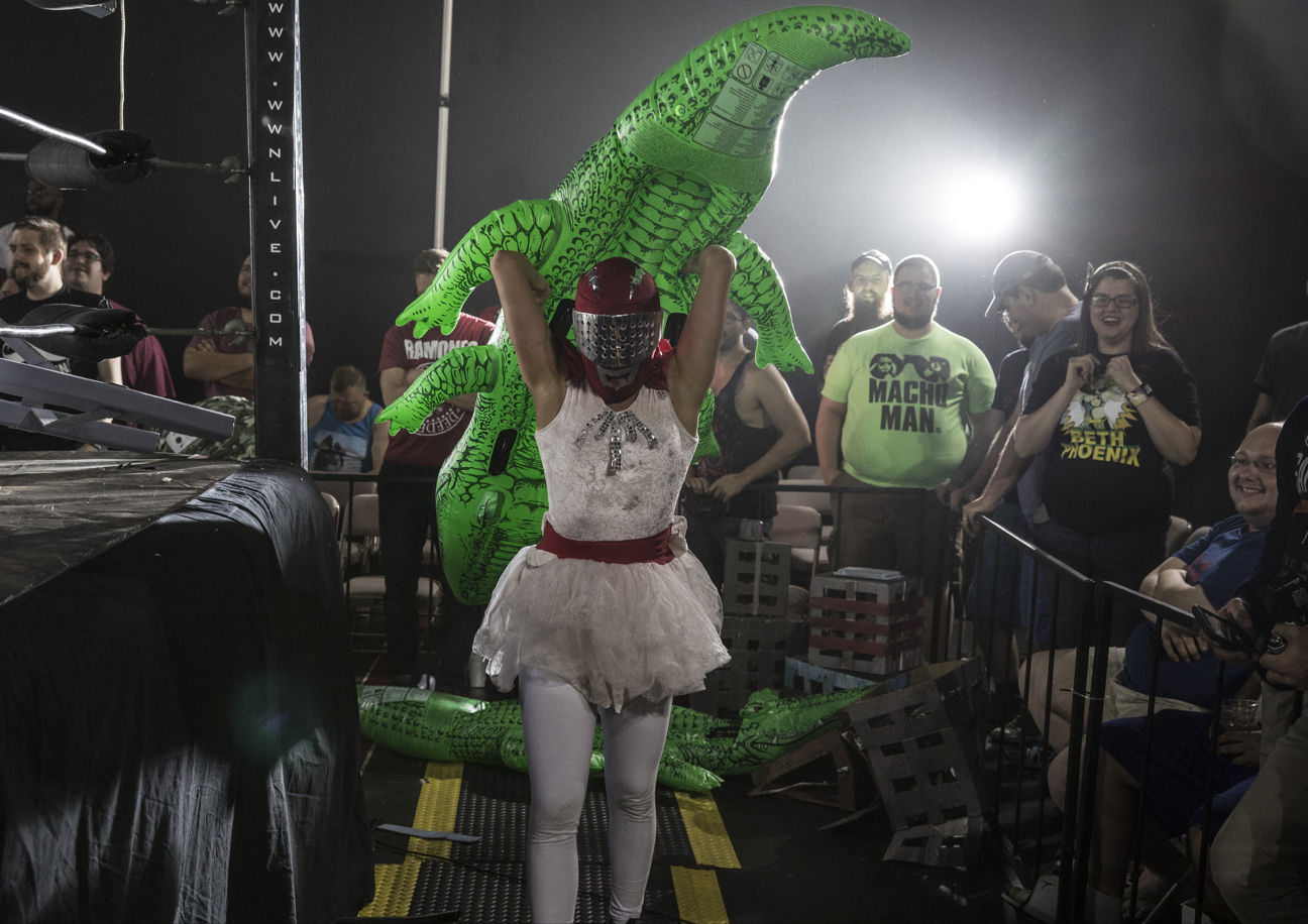 El área de ringside durante el show de Kaiju Big Battel presentó varios edificios y numerosos cocodrilos "gigantes" que fueron utilizados como armas y disuasivos. Aquí, el Powa Ranguru toma uno de los cocodrilos para lanzarlo contra el suelo, durante el choque titular de Kaiju Double Danger Tandem.