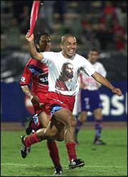 Santiago Morales festeja el segundo gol de El Nacional ecuatoriano, que goleó 3-0 al San Lorenzo argentino.