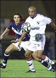 Leandro Somoza, de Vélez, corre a Gustavo Méndez, de Nacional; argentinos y uruguayos protagonizaron un entretenido 2-2.