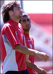 Federico Insúa y Daniel Montenegro durante el entrenamiento; las cosas se complicaron para Independiente