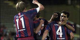 El arranque fue bien de rock. A los 4 pelota alta en profundidad del "Beto" Acosta que se disfrazó de lanzador, para que Frutos peine ante la salida de Albil y la mirada de Villavicencio y Salina a mitad de camino. 1-0 para el "Santo".