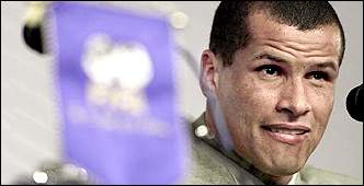 Rivaldo, de 30 años, y el club catalán pusieron fin el domingo una sociedad de cinco años y 235 partidos en los que el brasileño marcó 130 goles. El programa de televisión puso en contacto telefónico a Rivaldo Víctor Borba Ferreira con su compatriota Roberto Carlos, defensa del Real Madrid.