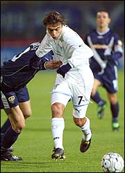 El argentino Claudio López de la Lazio se le escapa al brasileño Matuzalem del Brescia