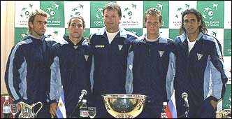 Lucas Arnold, Gastón Gaudio, el capitán Gustavo Luza, David Nalbandian y Mariano Zabaleta se preparan para enfrentar a Rusia