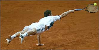 Marat Safin se estira para devolver una pelota durante su partido ante Paul-Henri Mathieu; el ruso mostró toda su clase y le dio el primer punto a su país en la final