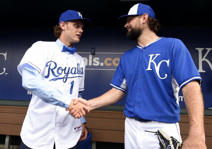 KANSAS CITY, MO - JUNE 17: After signing with the Kansas City Royals, number one draft pick Ashe Russell meets with Luke Hochevar #44 of the Kansas City Royals prior to a game against the Milwaukee Brewers at Kauffman Stadium on June 17, 2015 in Kansas City, Missouri. (Photo by Ed Zurga/Getty Images)
