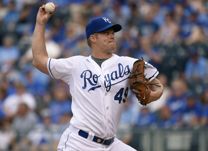 KANSAS CITY, MO - JUNE 17: Joe Blanton #49 of the Kansas City Royals throws in the first inning against the Milwaukee Brewers at Kauffman Stadium on June 17, 2015 in Kansas City, Missouri. (Photo by Ed Zurga/Getty Images)