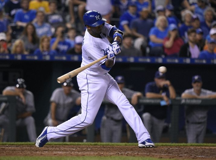 KANSAS CITY, MO - JUNE 17: Alcides Escobar #2 of the Kansas City Royals hits a three-run triple in the eighth inning against Milwaukee Brewers at Kauffman Stadium on June 17, 2015 in Kansas City, Missouri. (Photo by Ed Zurga/Getty Images)