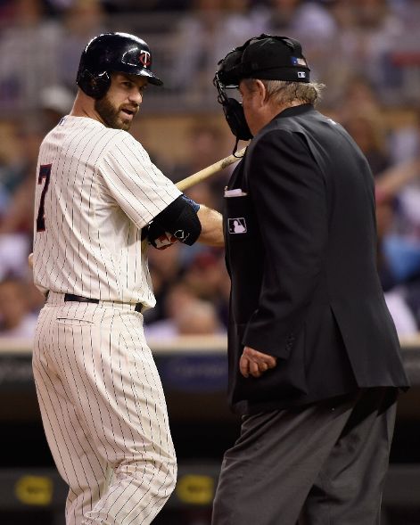 MINNEAPOLIS, MN - JUNE 17: Joe Mauer #7 of the Minnesota Twins speaks with home plate umpire Joe West #22 after striking out against the St. Louis Cardinals during the seventh inning of the game on June 17, 2015 at Target Field in Minneapolis, Minnesota. The Twins defeated the Cardinals 3-1. (Photo by Hannah Foslien/Getty Images)