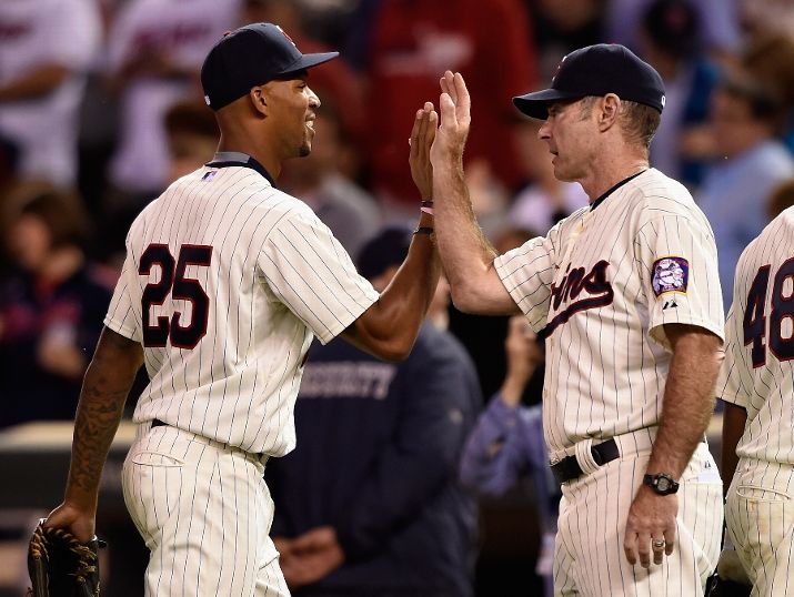 MINNEAPOLIS, MN - JUNE 17: Byron Buxton #25 and manager Paul Molitor #4 of the Minnesota Twins celebrate a win of the game against the St. Louis Cardinals on June 17, 2015 at Target Field in Minneapolis, Minnesota. The Twins defeated the Cardinals 3-1. (Photo by Hannah Foslien/Getty Images)