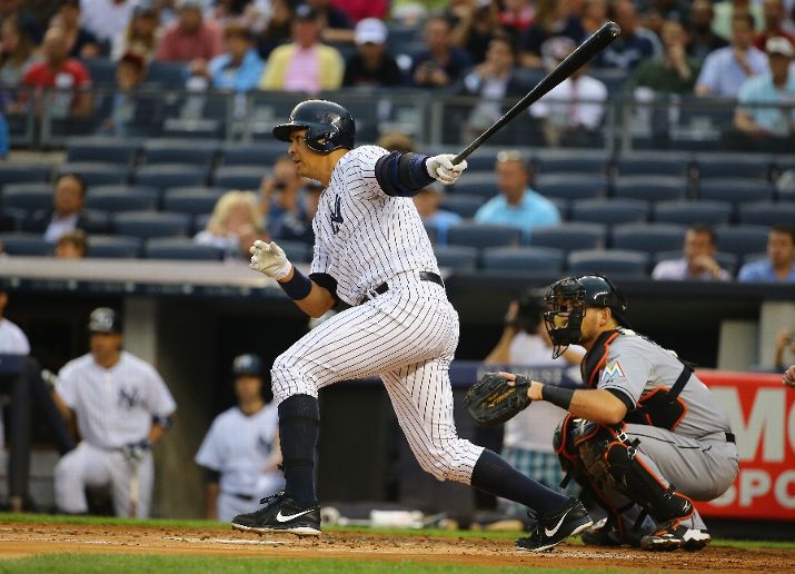 NEW YORK, NY - JUNE 17: Alex Rodriguez #13 of the New York Yankees drives in a run in the first inning against the Miami Marlins during their game at Yankee Stadium on June 17, 2015 in New York City. (Photo by Al Bello/Getty Images)