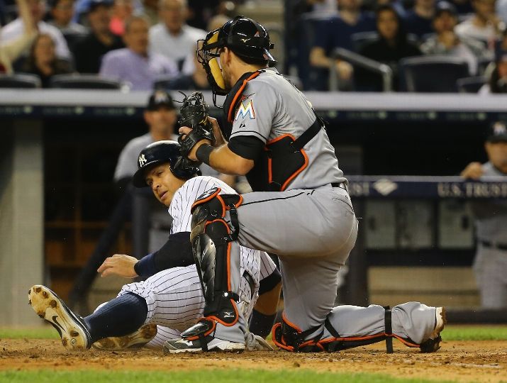 NEW YORK, NY - JUNE 17: Alex Rodriguez #13 of the New York Yankees is tagged out by Jeff Mathis #6 of the Miami Marlins in the fifth inning during their game at Yankee Stadium on June 17, 2015 in New York City. (Photo by Al Bello/Getty Images)