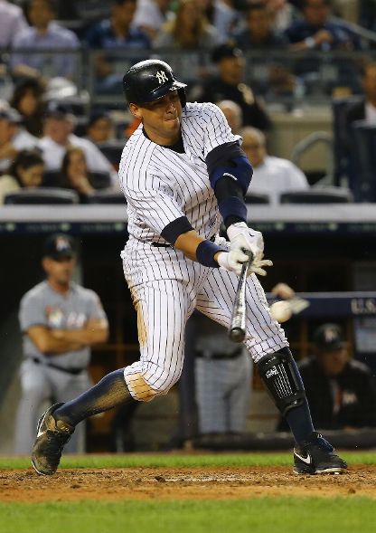 NEW YORK, NY - JUNE 17: Alex Rodriguez #13 of the New York Yankees hits a single in the fifth inning against the Miami Marlins during their game at Yankee Stadium on June 17, 2015 in New York City. (Photo by Al Bello/Getty Images)