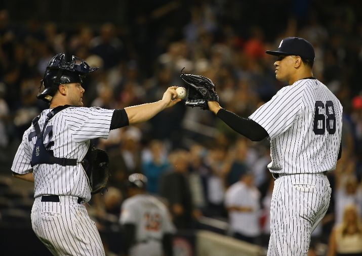 NEW YORK, NY - JUNE 17: Brian McCann #34 and Dellin Betances #68 of the New York Yankees celebrate a 2-1 win against the Miami Marlins after their game at Yankee Stadium on June 17, 2015 in New York City. (Photo by Al Bello/Getty Images)