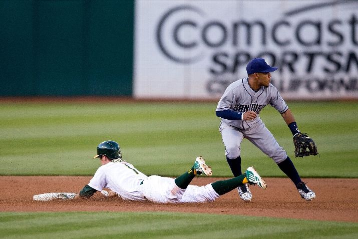 OAKLAND, CA - JUNE 17: Billy Burns #1 of the Oakland Athletics dives past Alexi Amarista #5 of the San Diego Padres for a double during the first inning at O.co Coliseum on June 17, 2015 in Oakland, California. (Photo by Jason O. Watson/Getty Images)