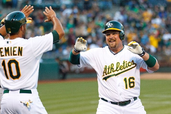 OAKLAND, CA - JUNE 17: Billy Butler #16 of the Oakland Athletics is congratulated by Marcus Semien #10 after hitting a three run home run against the San Diego Padres during the first inning at O.co Coliseum on June 17, 2015 in Oakland, California. (Photo by Jason O. Watson/Getty Images)