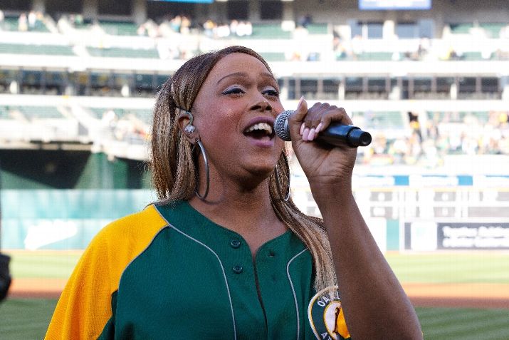 OAKLAND, CA - JUNE 17: Transgender opera singer Breanna Sinclair sings the national anthem before the game between the Oakland Athletics and the San Diego Padres at O.co Coliseum on June 17, 2015 in Oakland, California. (Photo by Jason O. Watson/Getty Images)