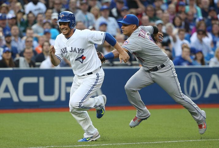 TORONTO, CANADA - JUNE 17: Danny Valencia #23 of the Toronto Blue Jays is tagged out by Ruben Tejada #11 of the New York Mets as he is caught in a run-down between home plate and third base in the second inning during MLB game action on June 17, 2015 at Rogers Centre in Toronto, Ontario, Canada. (Photo by Tom Szczerbowski/Getty Images)