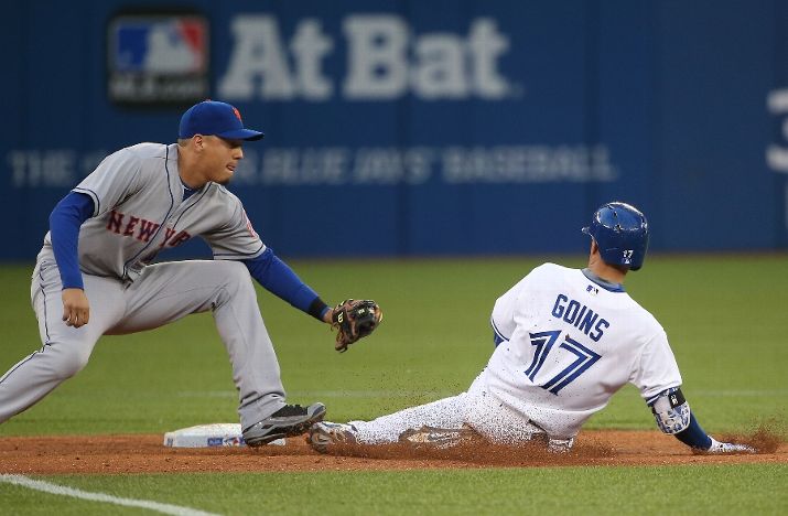 TORONTO, CANADA - JUNE 17: Wilmer Flores #4 of the New York Mets tags out Ryan Goins #17 of the Toronto Blue Jays as he tries to stretch a single into a double in the fifth inning during MLB game action on June 17, 2015 at Rogers Centre in Toronto, Ontario, Canada. (Photo by Tom Szczerbowski/Getty Images)
