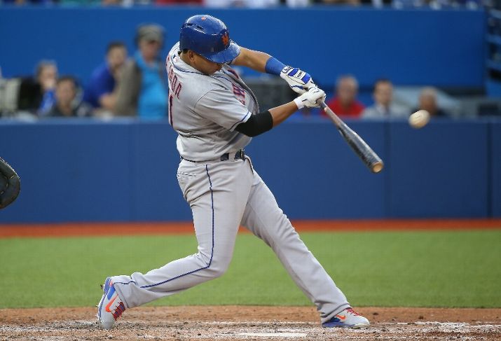TORONTO, CANADA - JUNE 17: Ruben Tejada #11 of the New York Mets hits a double in the fifth inning during MLB game action against the Toronto Blue Jays on June 17, 2015 at Rogers Centre in Toronto, Ontario, Canada. (Photo by Tom Szczerbowski/Getty Images)