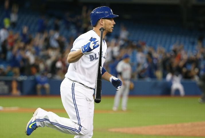 TORONTO, CANADA - JUNE 17: Danny Valencia #23 of the Toronto Blue Jays flips his bat after his three-run home run in the eighth inning during MLB game action against the New York Mets on June 17, 2015 at Rogers Centre in Toronto, Ontario, Canada. (Photo by Tom Szczerbowski/Getty Images)
