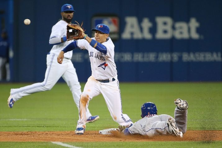 TORONTO, CANADA - JUNE 17: Dilson Herrera #2 of the New York Mets steals second base in the eighth inning during MLB game action as Ryan Goins #17 of the Toronto Blue Jays waits for the throw on June 17, 2015 at Rogers Centre in Toronto, Ontario, Canada. (Photo by Tom Szczerbowski/Getty Images)