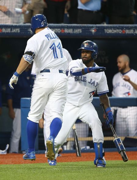 TORONTO, CANADA - JUNE 17: Kevin Pillar #11 of the Toronto Blue Jays is congratulated by Jose Reyes #7 after hitting a solo home run in the seventh inning during MLB game action against the New York Mets on June 17, 2015 at Rogers Centre in Toronto, Ontario, Canada. (Photo by Tom Szczerbowski/Getty Images)
