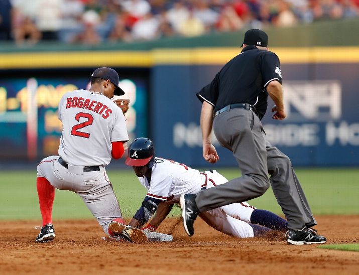 ATLANTA, GA - JUNE 17: Pedro Ciriaco #13 of the Atlanta Braves slides into second base on an error after his RBI single in the fourth inning against shortstop Xander Bogaerts #2 of the Boston Red Sox as second base umpire Ron Kulpa #46 looks on during the game at Turner Field on June 17, 2015 in Atlanta, Georgia. (Photo by Mike Zarrilli/Getty Images)