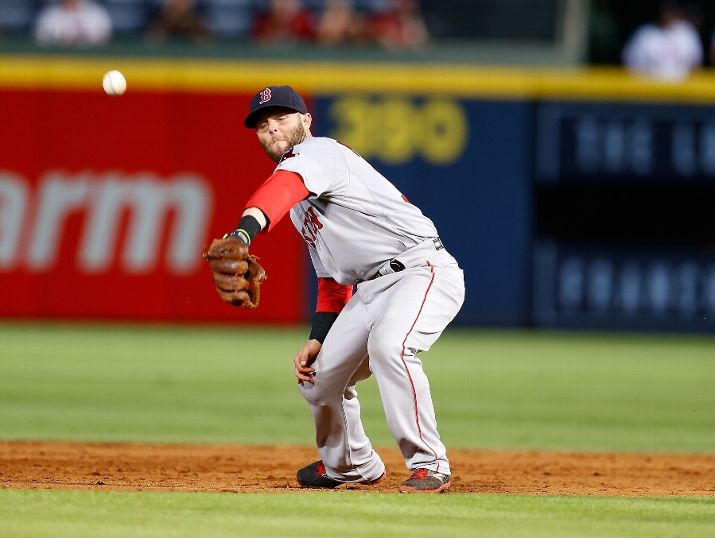ATLANTA, GA - JUNE 17: Second baseman Dustin Pedroia #15 of the Boston Red Sox mishandles a short hop in the seventh inning during the game against the Atlanta Braves at Turner Field on June 17, 2015 in Atlanta, Georgia. (Photo by Mike Zarrilli/Getty Images)
