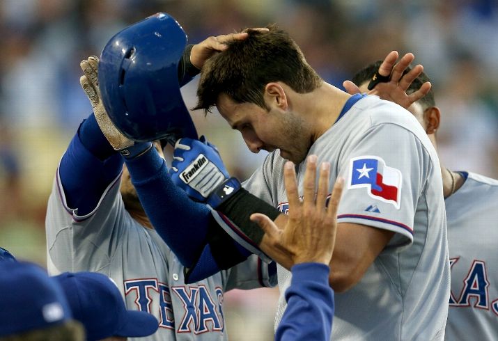 LOS ANGELES, CA - JUNE 17: Joey Gallo #13 of the Texas Rangers is greeted as he returns to the dugout after hitting a two run home run in the third inning against the Los Angeles Dodgers at Dodger Stadium on June 17, 2015 in Los Angeles, California. (Photo by Stephen Dunn/Getty Images)