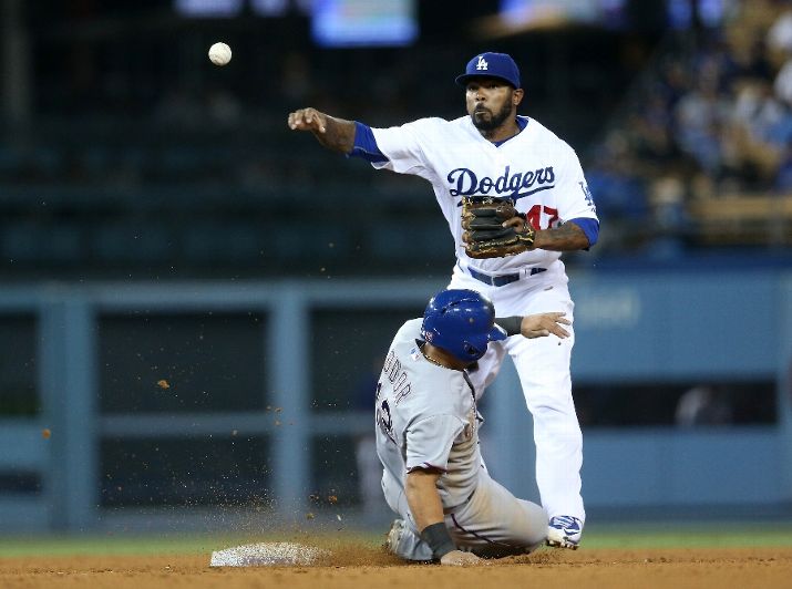 LOS ANGELES, CA - JUNE 17: Second baseman Howie Kendrick #47 of the Los Angeles Dodgers throws to first to complete a double play after forcing out Rougned Odor #12 of the Texas Rangers in the seventh inning at Dodger Stadium on June 17, 2015 in Los Angeles, California. (Photo by Stephen Dunn/Getty Images)