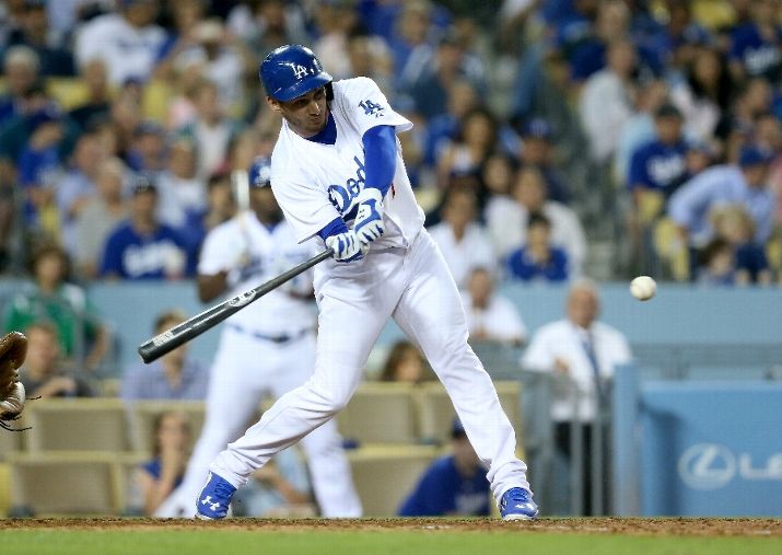 LOS ANGELES, CA - JUNE 17: Alex Guerrero #7 of the Texas Rangers hits a pinch hit RBI single in the sixth inning against the Los Angeles Dodgers at Dodger Stadium on June 17, 2015 in Los Angeles, California. (Photo by Stephen Dunn/Getty Images)