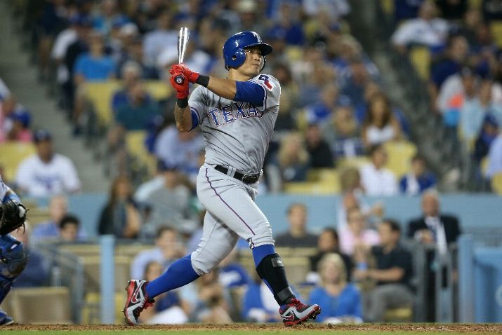 LOS ANGELES, CA - JUNE 17: Shin-Soo Choo #17 of the Texas Rangers hits a single in the eighth inning against the Los Angeles Dodgers at Dodger Stadium on June 17, 2015 in Los Angeles, California. (Photo by Stephen Dunn/Getty Images)
