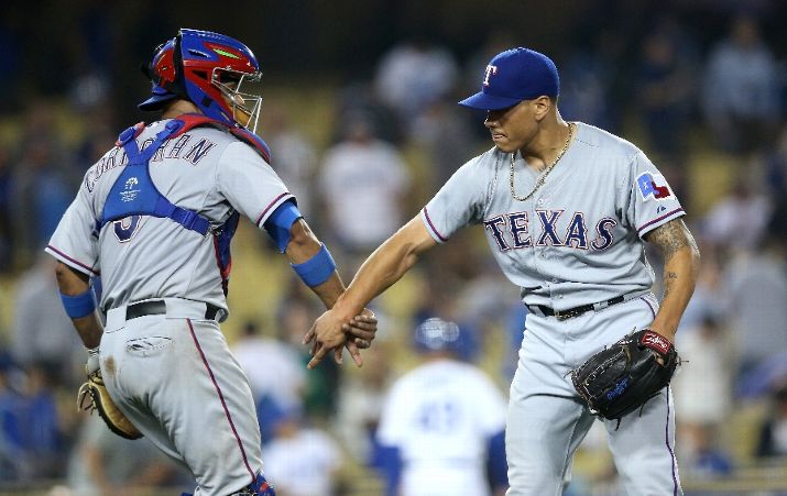 LOS ANGELES, CA - JUNE 17: Closer Keone Kela #50 of the Texas Rangers celebrates with catcher Carlos Corporan #3 after pitching the ninth inning and picking up the save against the Los Angeles Dodgers at Dodger Stadium on June 17, 2015 in Los Angeles, California. The Rangers won 5-3. (Photo by Stephen Dunn/Getty Images)