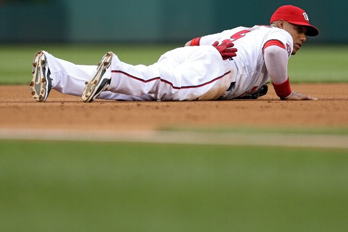 WASHINGTON, DC - JUNE 17: Third baseman Yunel Escobar #5 of the Washington Nationals looks on after missing a ball hit by Steven Souza Jr. #20 of the Tampa Bay Rays (not pictured) in the second inning at Nationals Park on June 17, 2015 in Washington, DC. (Photo by Patrick Smith/Getty Images)