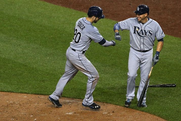 WASHINGTON, DC - JUNE 17: Steven Souza Jr. #20 of the Tampa Bay Rays celebrates with teammate Asdrubal Cabrera #13 after scoring in the eighth inning against the Washington Nationals at Nationals Park on June 17, 2015 in Washington, DC. (Photo by Patrick Smith/Getty Images)