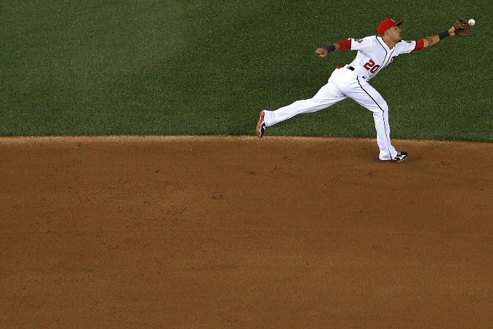 WASHINGTON, DC - JUNE 17: Ian Desmond #20 of the Washington Nationals misses a ball hit by Evan Longoria #3 of the Tampa Bay Rays in the sixth inning at Nationals Park on June 17, 2015 in Washington, DC. (Photo by Patrick Smith/Getty Images)