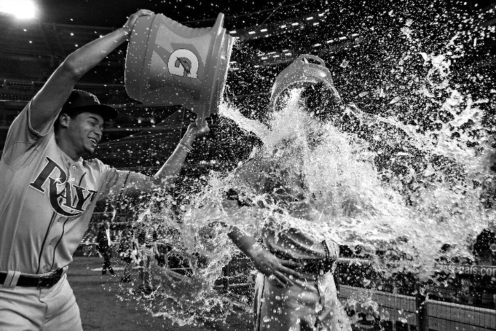 WASHINGTON, DC - JUNE 17: (EDITORS NOTE: This image has been converted to black and white) Steven Souza Jr. #20 of the Tampa Bay Rays (center) is doused by teammate Chris Archer #22 (left) and David DeJesus #7 (back right) after defeating the Washington Nationals at Nationals Park on June 17, 2015 in Washington, DC. The Tampa Bay Rays won, 5-0. (Photo by Patrick Smith/Getty Images)
