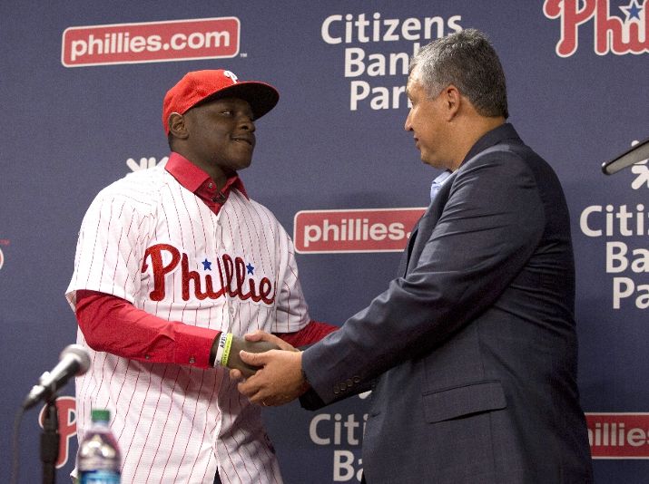 PHILADELPHIA, PA - JUNE 17: The Philadelphia Phillies 2015 first round pick Cornelius Randolph #2 shakes hands with Phillies Director of Amateur Scouting Johnny Almaraz at a news conference prior to the game agianst the Baltimore Orioles on June 17, 2015 at the Citizens Bank Park in Philadelphia, Pennsylvania. (Photo by Mitchell Leff/Getty Images)