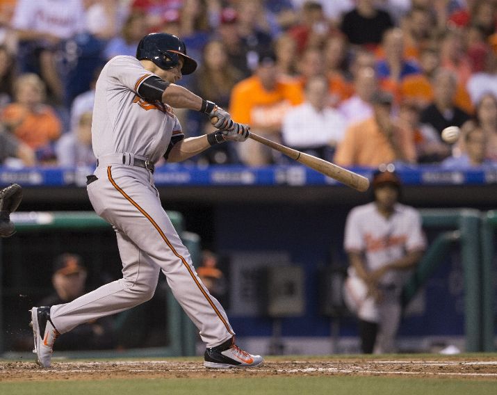 PHILADELPHIA, PA - JUNE 17: David Lough #9 of the Baltimore Orioles hits an RBI double in the top of the third inning against the Philadelphia Phillies on June 17, 2015 at the Citizens Bank Park in Philadelphia, Pennsylvania. (Photo by Mitchell Leff/Getty Images)