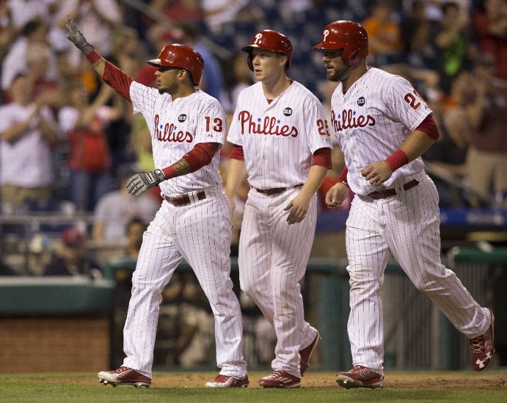 PHILADELPHIA, PA - JUNE 17: Freddy Galvis #13, Cody Asche #25, and Cameron Rupp #29 of the Philadelphia Phillies walk back to the dugout after Galvis hit a three run home run in the bottom of the seventh inning against the Baltimore Orioles on June 17, 2015 at the Citizens Bank Park in Philadelphia, Pennsylvania. The Orioles defeated the Phillies 6-4. (Photo by Mitchell Leff/Getty Images)